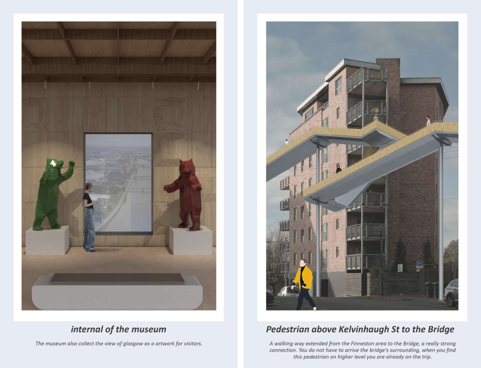 Bridges always stand for connection and bearing. A bridge of memory will be built in this project. It is a living bridge with different functional areas for connecting the separated city on the one hand, more importantly, it will be helpful to reconnect Glasgow’s citizens and culture by evoking and creating people’s memory. Memory of the City, memory of citizens’ life. By evoking the memory of Glasgow and River Clyde, past and now can be connected; By evoking citizens memory of their own life, Glasgow city and world can be connected; By creating great new memories, today’s Glasgow can be connected with people’s future life. The better connection can be built by the meeting of physical city and memories from different people.