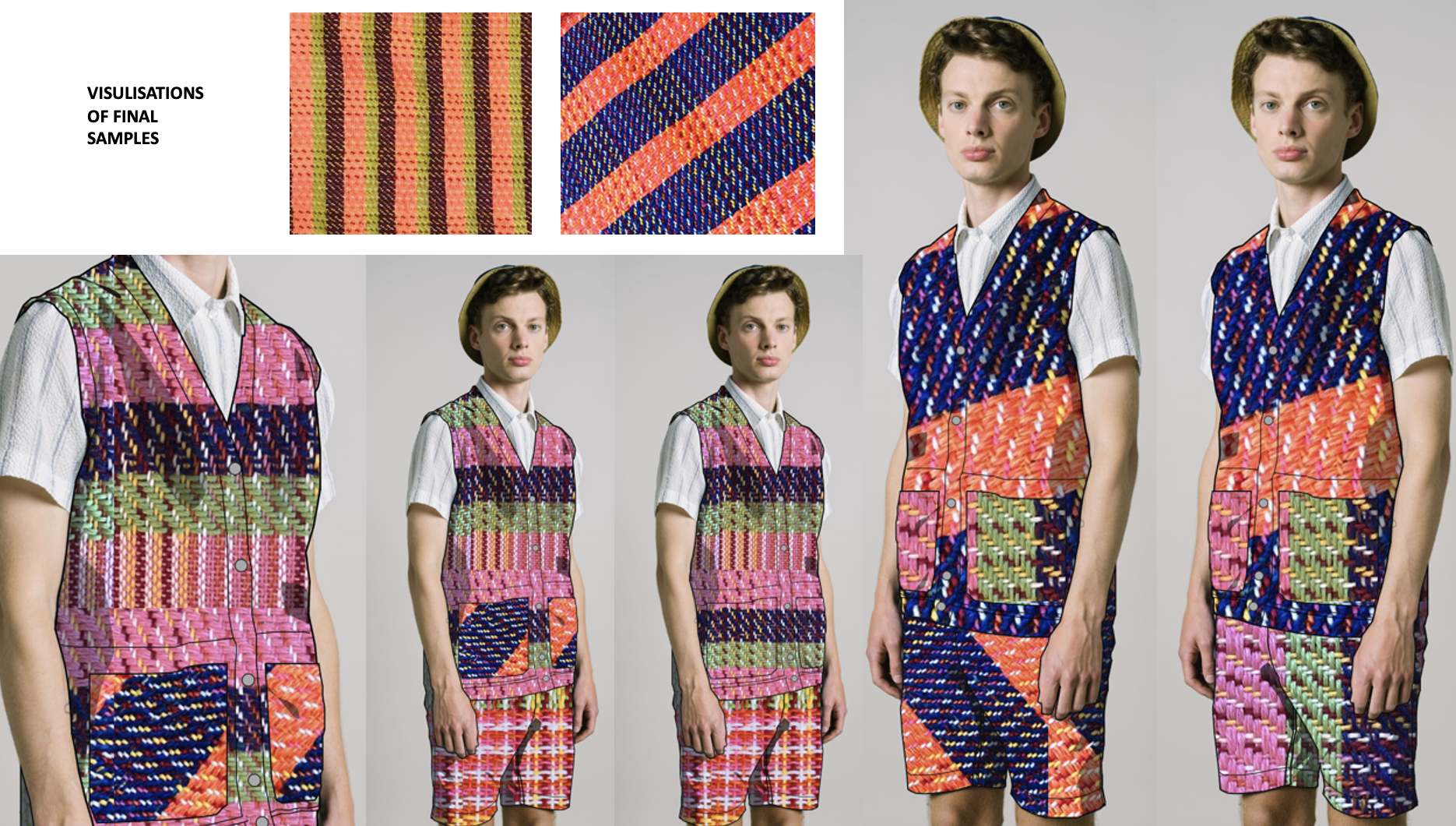 I am a Scottish textile designer specialising in woven fabrics. The theme surrounding this project is focused on taking inspiration when out on runs with my dog through my local countryside/farmland areas. Through this I discovered many interesting textures, shapes and colours from old abandoned tractors and other industrial machinery. I have visualised my designs for mens casual wear. I used a number of yarns merino sport, recycled plastic yarns, sparkled yarns, cottons and wools.